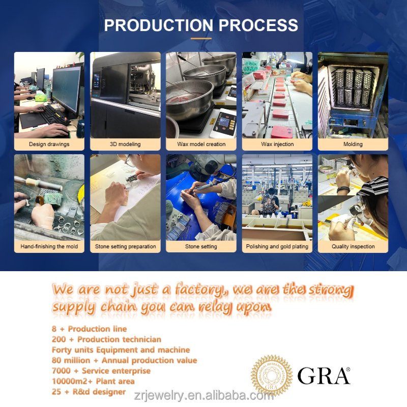 Employing over 200 staff, covering an area of 15,000 square meters, equipped with 8 production lines, with an annual capacity of nearly 3 million pieces. We have in-house cutting, polishing, and setting facilities, with over 70 setters with more than 5 years of experience, 25 R&D designers, and a quality control team of 12. Our international trade team consists of nearly 50 members.