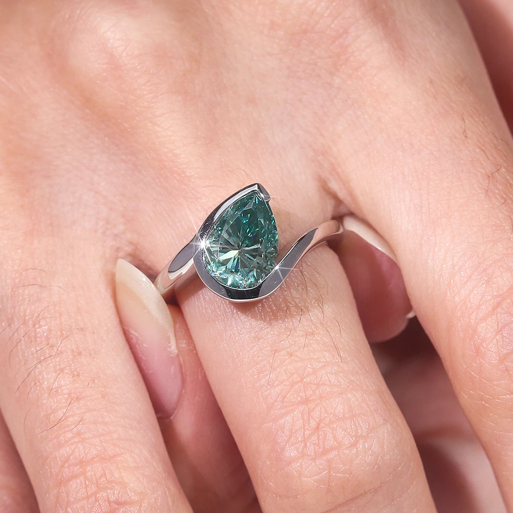 A captivating engagement ring crafted in high-quality 925 sterling silver, featuring a striking 7×10mm pear-cut blue-green moissanite. The elongated pear shape enhances brilliance while the unique ocean-toned color creates a bold yet elegant statement. Designed for women who appreciate distinctive beauty, this ring blends modern sophistication with timeless romance—perfect for engagements, anniversaries, or standout fine-jewelry collections.
