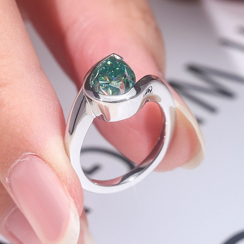 Moissanite Rings 925 Sterling Silver 7*10mm Pear Cut Blue Green Moissanite Engagement Ring for Women